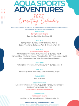 Whether you making a reservation for the day or planning your family’s vacation, we’ve provide our 2025 Rental Season Operational Calendar to help you make memories out on the water.