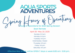 Serving our community since 1995, Aqua Sports Adventures prides ourselves on providing clean, performance worthy, and well-maintained vessels. "Seas the Day and make some waves."We offer a full array of boats, tubes, water mats, floats, cooler, and other accessories to meet any water recreational need you may have. Find a cove, drop anchor, and enjoy the sunshine.